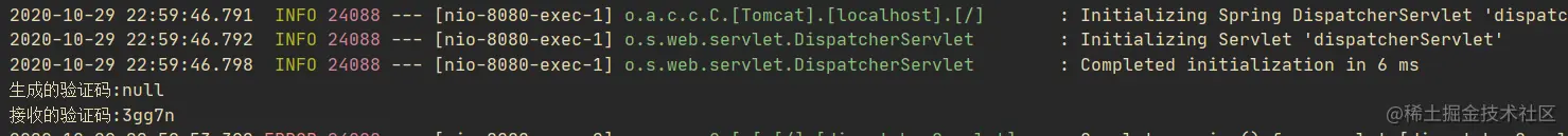 null?难道是这个接口没有生成验证码还是生成了但没有正确的传过来?于是我便在CommonController也打印下这个验证码。