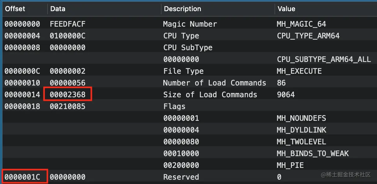 Load Command 是 Mach-O 文件中除了文件头以外最重要的结构,它描述了 Data 中的各个段信息,比如每个段的段名、段的长度、在文件中的偏移、读写权限以及段的其他属性,它的位置要由 Header 的大小决定,下面是 Load Command 的起始位置和结束位置: