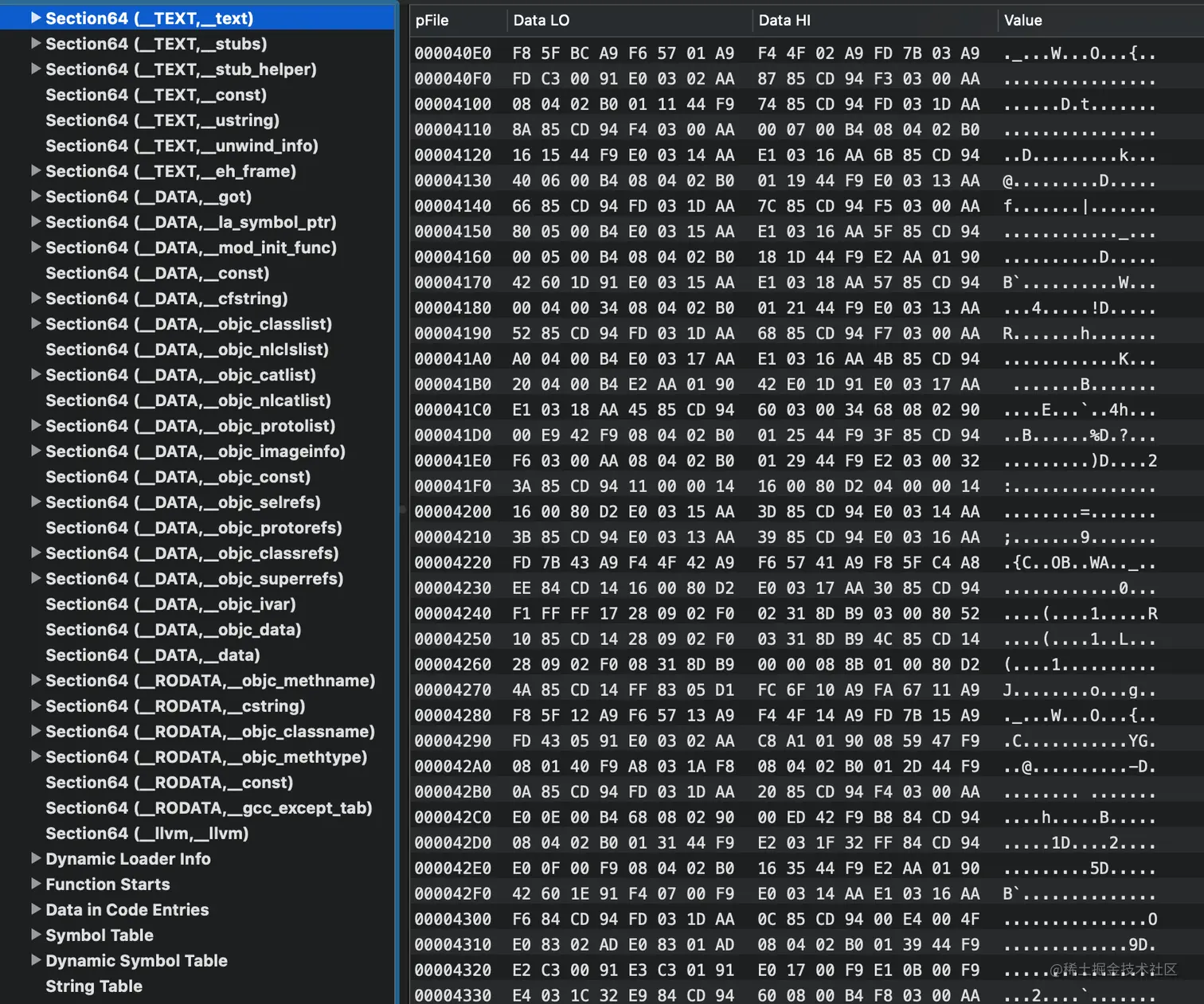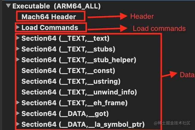 - Data: 被 Load commands 描述的各个 Section,包括编写的指令代码,定义的常量变量等,还包括符号表,字符串表等等其他我们比较熟悉的段,也就是说我们所写的应用程序会被拆分成一个个的 Section 存储在 Mach-O 文件中。