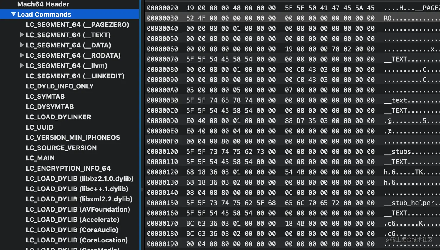Load Command 的起始偏移和结束偏移分别为 0x20 和 0x2380。0x20 换算成 10 进制是 32,正好是 Header 的大小,0x2380 和 0x20 差值正好是 Header 中 Size of Load Commands 的值 0x2368,由此也验证了 Load Command 的位置是紧随 Header 后面的。