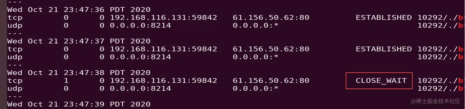 使用netstat -annp查看连接状态处于close_wait状态,则说明在CDN关闭连接后,客户端没有关闭连接。