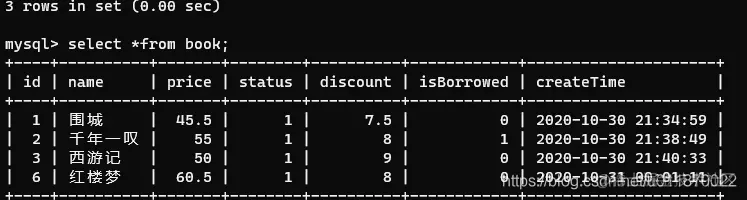 create table if not exists book(id int primary key auto_increment,name varchar(20),price double,status tinyint(1),discount float,isBorrowed tinyint(2) default 0, createTime datetime default now());
