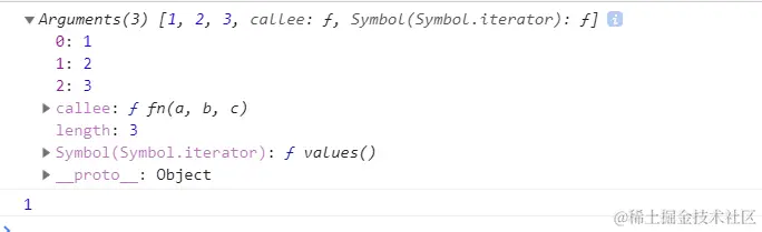 arguments对象 改天一起吃火锅啊 2020-10-30 117 阅读1分钟 arguments对象是一个对应传递给函数参数的类数组对象。 function fn(a,b,c){ console.log(arguments) console.log(arguments[0]) } fn(1,2,3) 注意:arguments对象不是数组,除了length属性和索引元素之外没有任何数组属性。但可被转化成数组。 转化为数组: function fn(){ const args = Array.prototype.slice.call(arugmens) }