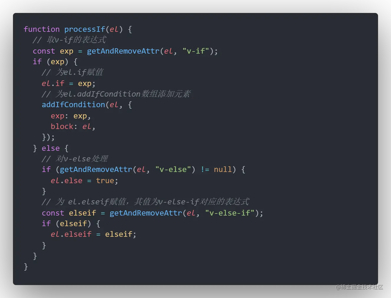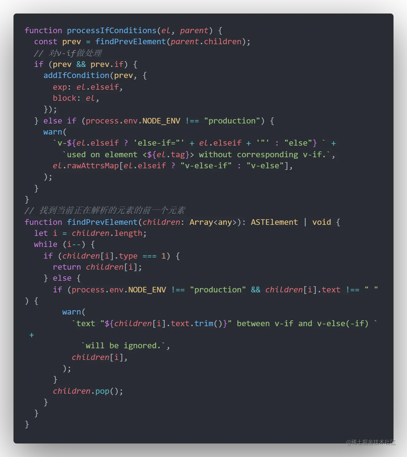 - **如果前一个元素带有if指令:**提取v-else-if指令表达式并和元素一起构建成一个对象,推入带有v-if元素的ifCondition数组中