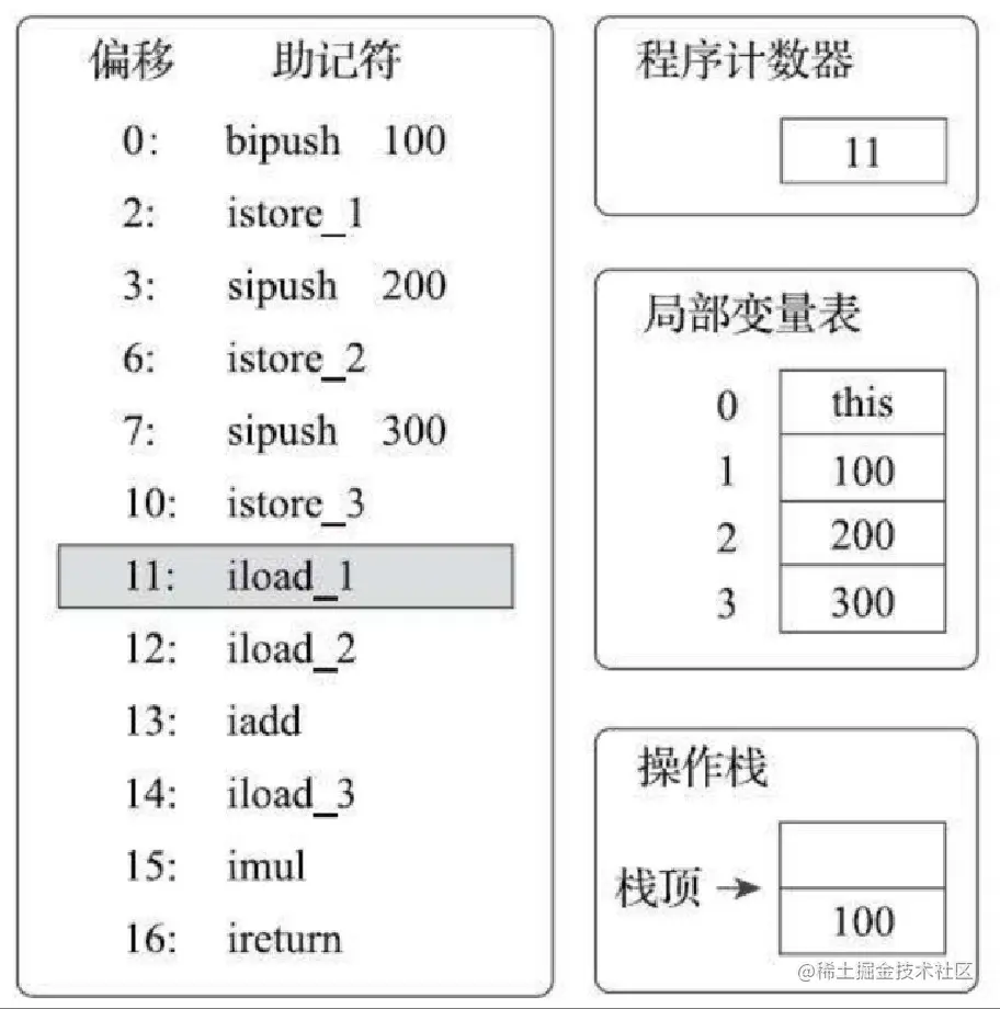执行偏移地址为2的指令,istore_1指令的作用是将操作数栈顶的整型值出栈并存放到第1个局部变量槽中。后续4条指令(直到偏移为11的指令为止)都是做一样的事情,也就是在对应代码中把变量a、b、c赋值为100、200、300。这4条指令的图示略过。 图8-7 执行偏移地址为11的指令的情况