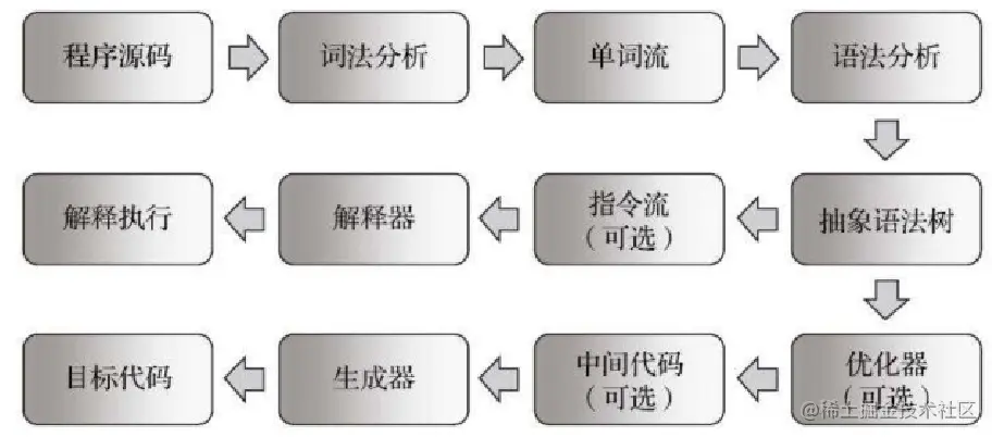 大部分的程序代码转换成物理机的目标代码或虚拟机能执行的指令集之前,都需要经过图8-4中的各个步骤。