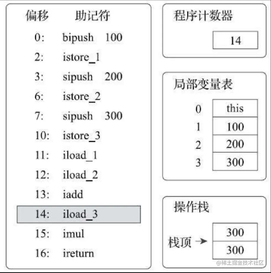 执行偏移地址为14的指令,iload_3指令把存放在第3个局部变量槽中的300入栈到操作数栈中。这时操作数栈为两个整数300。下一条指令imul是将操作数栈中头两个栈顶元素出栈,做整型乘法,然后把结果重新入栈,与iadd完全类似。