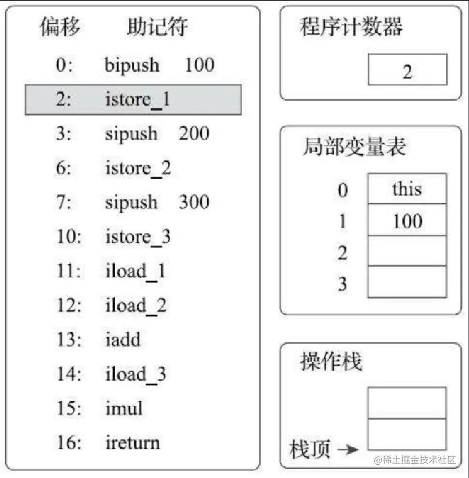 首先,执行偏移地址为0的指令,Bipush指令的作用是将单字节的整型常量值(-128~127)推入操作数栈顶,跟随有一个参数,指明推送的常量值,这里是100。 图8-6 执行偏移地址为1的指令的情况