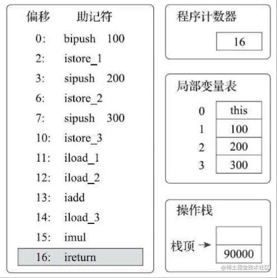 执行偏移地址为16的指令,ireturn指令是方法返回指令之一,它将结束方法执行并将操作数栈顶的整型值返回给该方法的调用者。到此为止,这段方法执行结束。