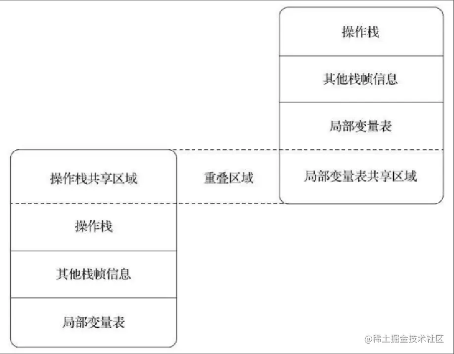 在大多虚拟机的实现里都会进行一些优化处理,令两个栈帧出现一部分重叠。让下面栈帧的部分操作数栈与上面栈帧的部分局部变量表重叠在一起,这样做不仅节约了一些空间,更重要的是在进行方法调用时就可以直接共用一部分数据,无须进行额外的参数复制传递了,重叠的过程如图8-2所示。