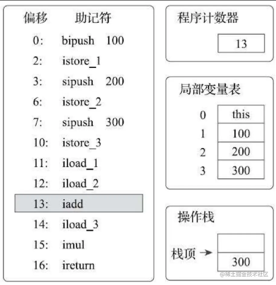 执行偏移地址为13的指令,iadd指令的作用是将操作数栈中头两个栈顶元素出栈,做整型加法,然后把结果重新入栈。在iadd指令执行完毕后,栈中原有的100和200被出栈,它们的和300被重新入栈。 图8-10 执行偏移地址为14的指令的情况