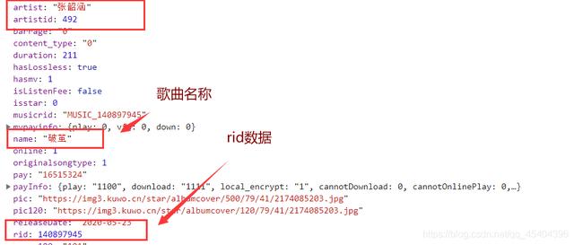 其中name和artist关键字对应的值为展示用和最终.mp3文件名称,rid关键字对应的值是为后面过程所用。