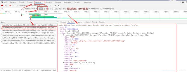 然后回车,可以得到搜索相应的歌曲列表,然而这些数据都是动态加载的,使用requests模块如果直接请求这个网址,根本不可能得到这些数据,这个时候我们可以按电脑键盘F12,来到开发者模式,点击Network下面的XHR,找到这些歌曲列表的那个网址,具体为: