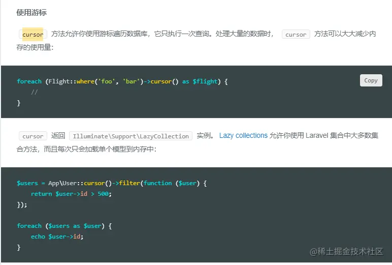 本来导出想用fastadmin自带的导出功能,但是因为我数据量有16w,一导出就报内存溢出。问题的原因是我用了get去获取全部数据。因为10w+的数据全部加载到内存中,导致了内存的溢出。后来想到了tp有一个cursor游标查询,然后laravel也有一个,先看下laravel文档对游标查询的介绍
