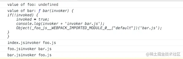 => 进入foo.js后往下执行,执行console.log('value of bar:', bar); 这行代码 输出bar是一个函数,然后初始化foo函数完成,最终导出foo