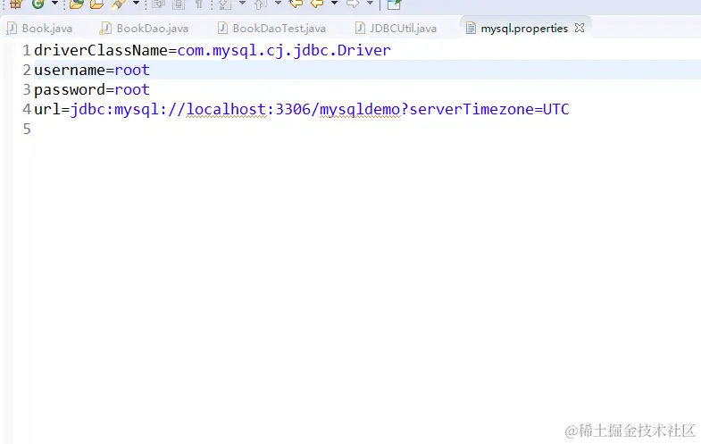 因此我们可以通过一个工具类来封装一个获取Connection对象的方法,从而达到代码复用,减少重复的代码。同时我们连接MySQL数据的配置信息比如 url,user,password等信息可以配置在一个文件中,以后我们修改配置信息时只需要在文件中修改就好了,不用去修改源代码,从而降低代码之间的耦合度。在此次中我们将链接数据库所需要的信息存储到一个 mysql.properties,采用 key = value的形式存储键值对:
