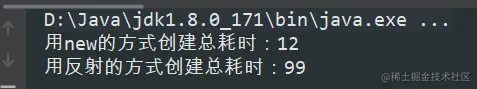 System.out.println("用反射的方式创建总耗时:" + (end2 - end));