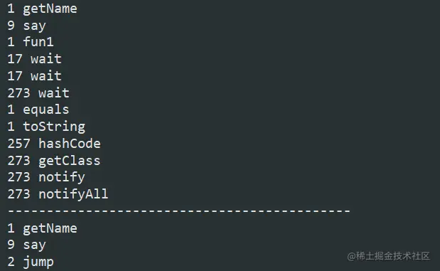 执行一下,我们发现 getMethods 获取的方法有很多, 这是因为 getMethods 方法是获取获取当前类以及父类中所有公有的方法,而 getDeclaredMethods 是获取本类中所有的方法,包括私有的。