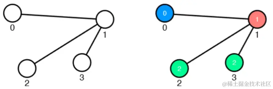图的着色问题图论和计算机科学的一个经典问题。 给定一个无向图 G,为图中的每一个节点着色。一个合法的图着色方案必须要满足条件:任意两相邻节点的颜色不同。问题是,希望找到使用颜色数尽可能少的着色方案。如下图所示,一个包含 4 个节点的图,以及一种着色方案。这个着色方案使用了 3 种颜色,但不是最优的,可以找到只使用 2 种颜色的着色方案。