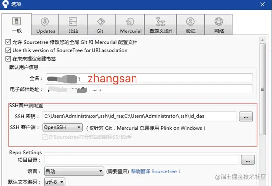 安装好Sourcetree后,打开“工具”--》“选项”--》“一般”,其中SSH客户端配置: