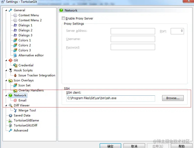 - 安装好TortoiseGit后,打开“Settings"-->"Network"选项,修改SSH client为git目录下的ssh.exe(C:\Program Files\Git\usr\bin\ssh.exe)