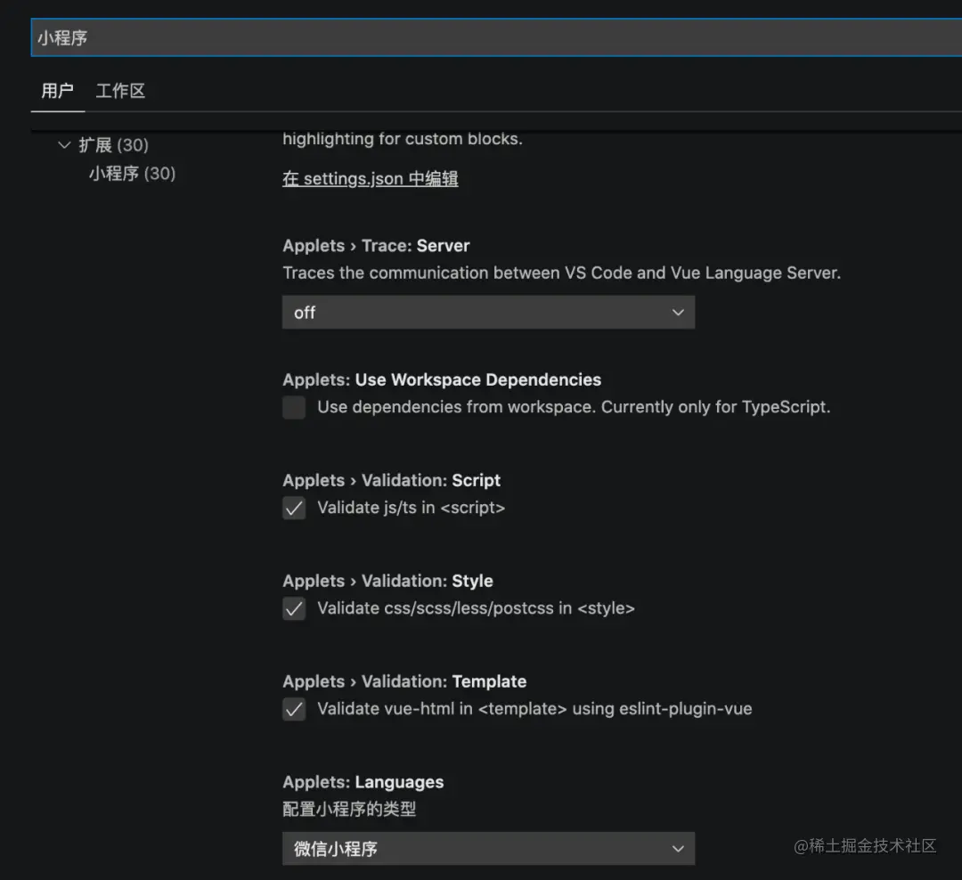 为了能够让插件更灵活,这个插件同时支持微信,百度,qq,支付宝,头条,京东,这6种小程序都支持,在不同的文件类型下可以提示不同的语法和指令等,通过在设置里面配置小程序的类型就可以了。