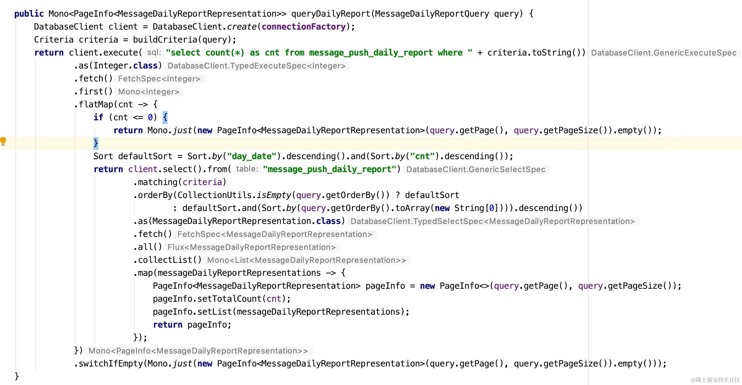 对于复杂的查询,我们也可以直接使用spring-data-r2dbc的API实现。例如: