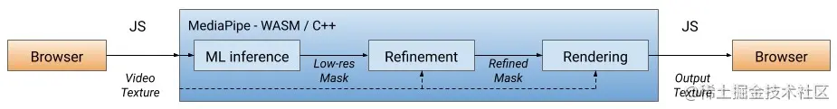 我们的解决方案首先通过将用户从背景中分割出来(后面将详细介绍我们的分割模型),利用机器学习推理计算一个低分辨率的 mask 来处理每个视频帧。另外,我们还可以进一步精修 mask,使其与图像边界对齐。然后通过 WebGL2 应用 mask 渲染视频输出,这时背景就模糊或替换了。