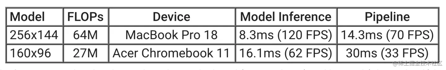 我们在两个常见的设备上评估了模型推理和端到端 pipeline 的速度: 2.2 GHz 6核英特尔酷睿 i7的 MacBook Pro 2018和英特尔赛扬 N3060的宏基 Chromebook 11。对于 720p 的输入,MacBook Pro 可以以 120 FPS 的速度运行高质量模型,以 70 FPS 的速度运行端到端 pipeline,而 Chromebook 以 62 FPS 的速度运行低质量模型,以 33 FPS 的速度运行端到端 pipeline。