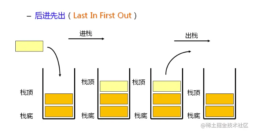 栈是一种遵从 后进先出(LIFO)原则的有序集合。新添加或待删除的元素都保存在栈的同一端,称作栈顶,另一端就叫栈底。在栈里,新元素都靠近栈顶,旧元素都接近栈底。如图: