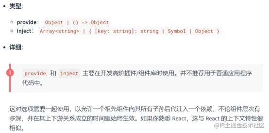 provide:是一个对象,或者是一个返回对象的函数。该对象包含可注入其子孙的子孙的属性和属性值。 injcet:一个字符串数组,或者是一个对象。当其为字符串数组时,使用方式和props十分相似,只不过接收的属性由data变成了provide中的属性。当其为对象时,也和props类似,可以通过配置default和from等属性来设置默认值,在子组件中使用新的命名属性等。
