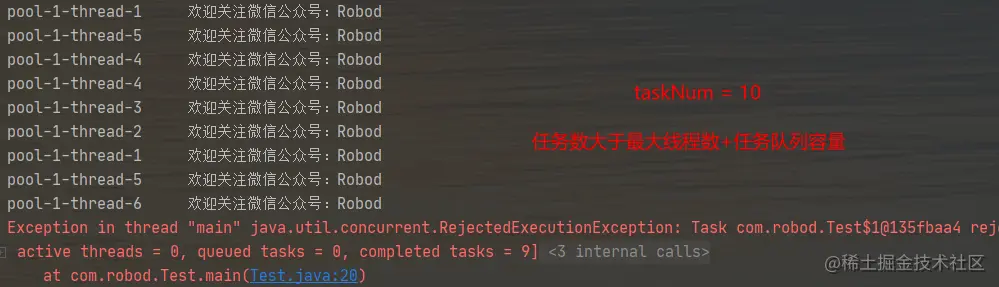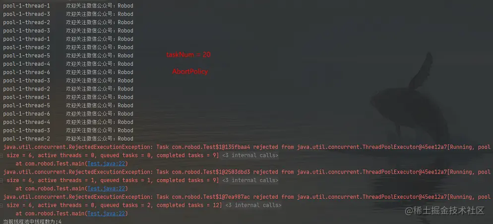 AbortPolicy:这个是默认的策略,当线程池中的线程都在工作,并且任务队列已满的时候,再试图进来任务的话execute方法就会抛出异常,记得一定要捕获异常,不然程序就会终止。这里将任务数设为20,最终有三个任务没能执行,抛出了异常。