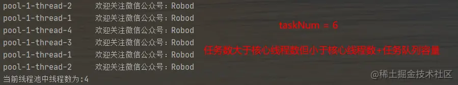 第二种情况👆,任务数超过了核心线程数,但没有超过核心线程数+任务队列容量的时候,会将处理不过来的任务放在任务队列中,然后复用核心线程去处理任务,不会去创建临时工线程。