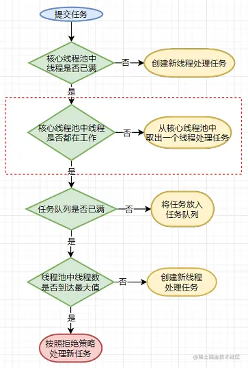 这张流程图和《Java并发编程的艺术》里面的差不多,图中用红色虚线框起来的是我在其基础上添加的,这是我对线程池处理任务流程的理解。