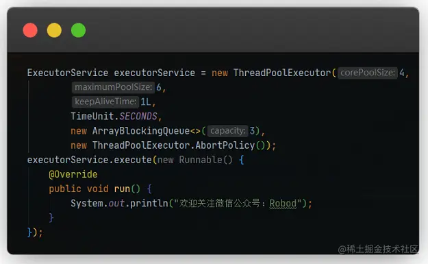 要执行任务的话就调用execute方法,传入一个Runnable对象,任务逻辑写在run方法里。