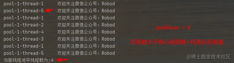 接下来通过调整taskNum的值,来观察线程池的执行情况: