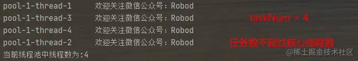- corePoolSize:核心线程池中的线程数,作用上一节已经说过了,这里大小设的是4,和文章开头的示意图一样