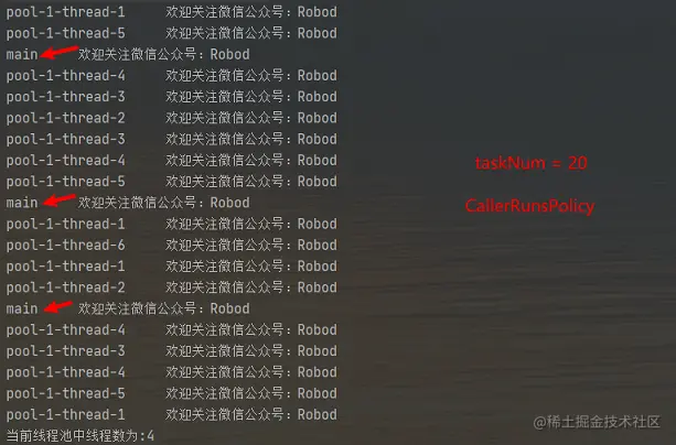 CallerRunsPolicy:只用调用者所在线程来运行任务,什么意思呢?比如下图,我是在主线程中调用线程池去处理任务的,现在有三个任务线程池没来得及处理,就交给调用者,也就是主线程来执行。 -