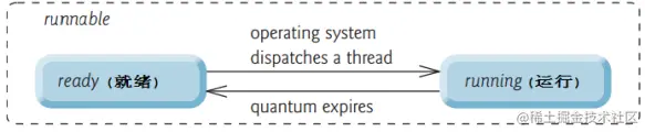 (2)有的说Java线程6种状态,这是因为将将Running和Ready两种状态拆分开了,6种状态为: