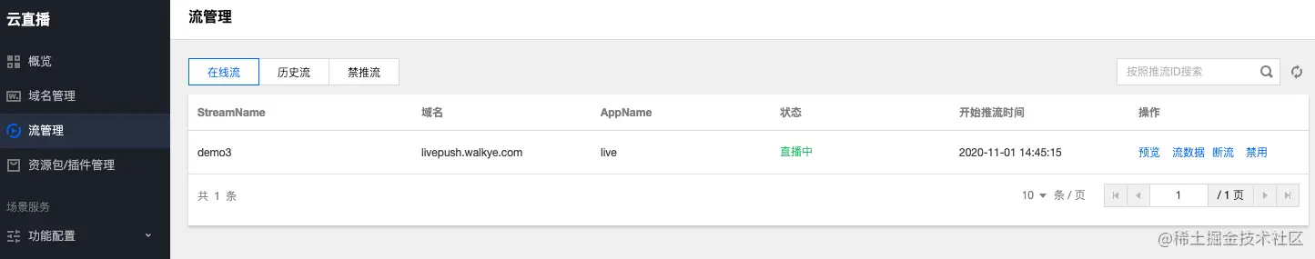 而此时再去腾讯云-直播服务中查看正在直播的流也可以看到