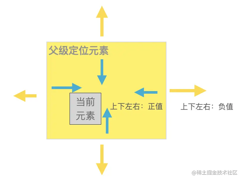 基于四个父元素的边框,如果left,top,或者right,bottom是负值,则从父元素的边框,向外走,如果是正值,则从父元素的边框,向内走。