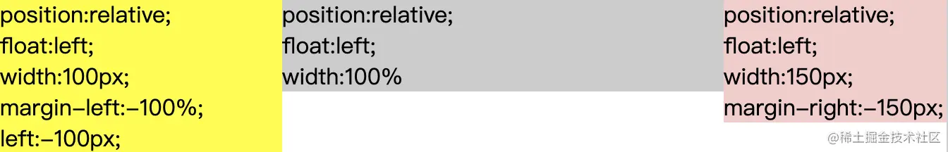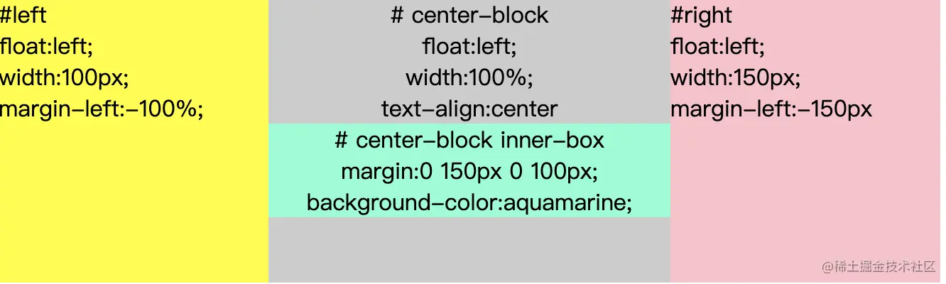 子元素采用float的方式,中间元素采用内置元素margin空出两侧的内容,中间区域面积依然包含占100%,被左右改变了布局的块遮挡了内容,只有中间区域的子元素占中间的自适应区域