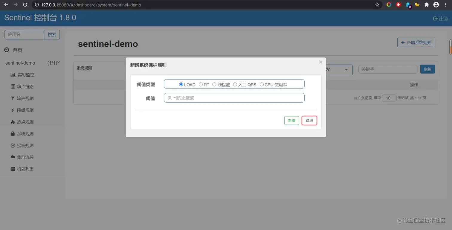 - 并发线程数:当单台机器上所有入口流量的并发线程数达到阈值即触发系统保护。