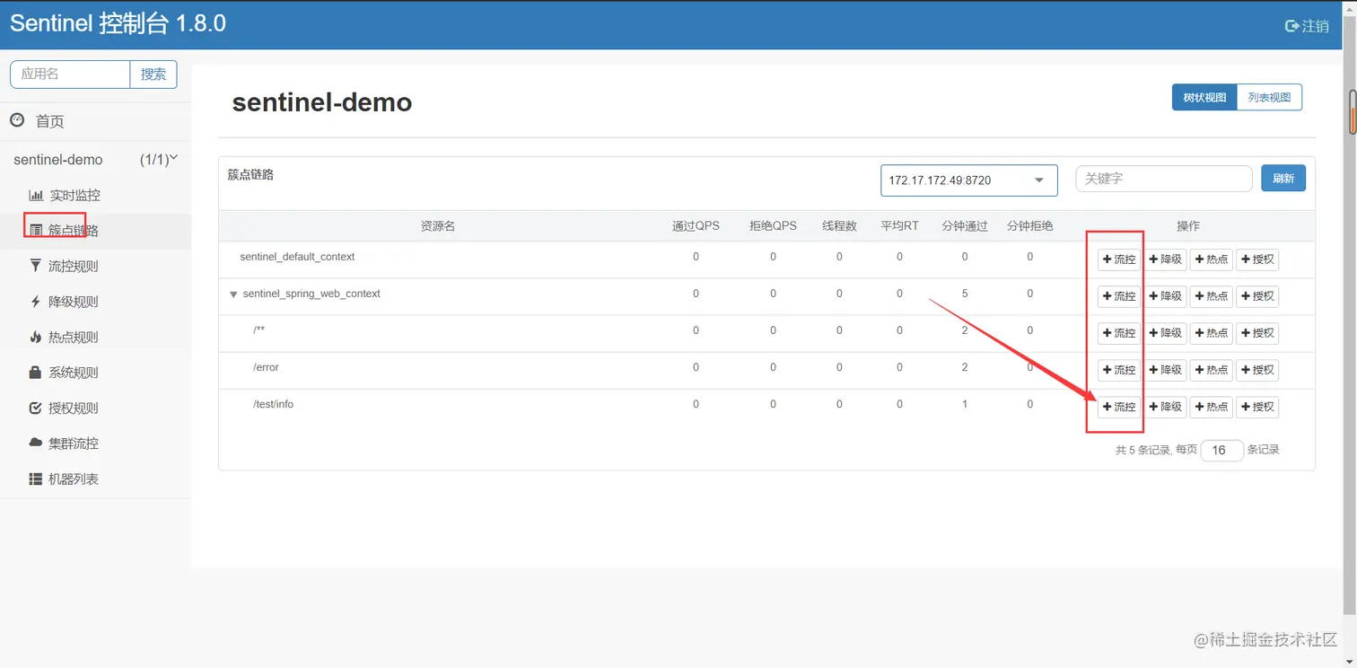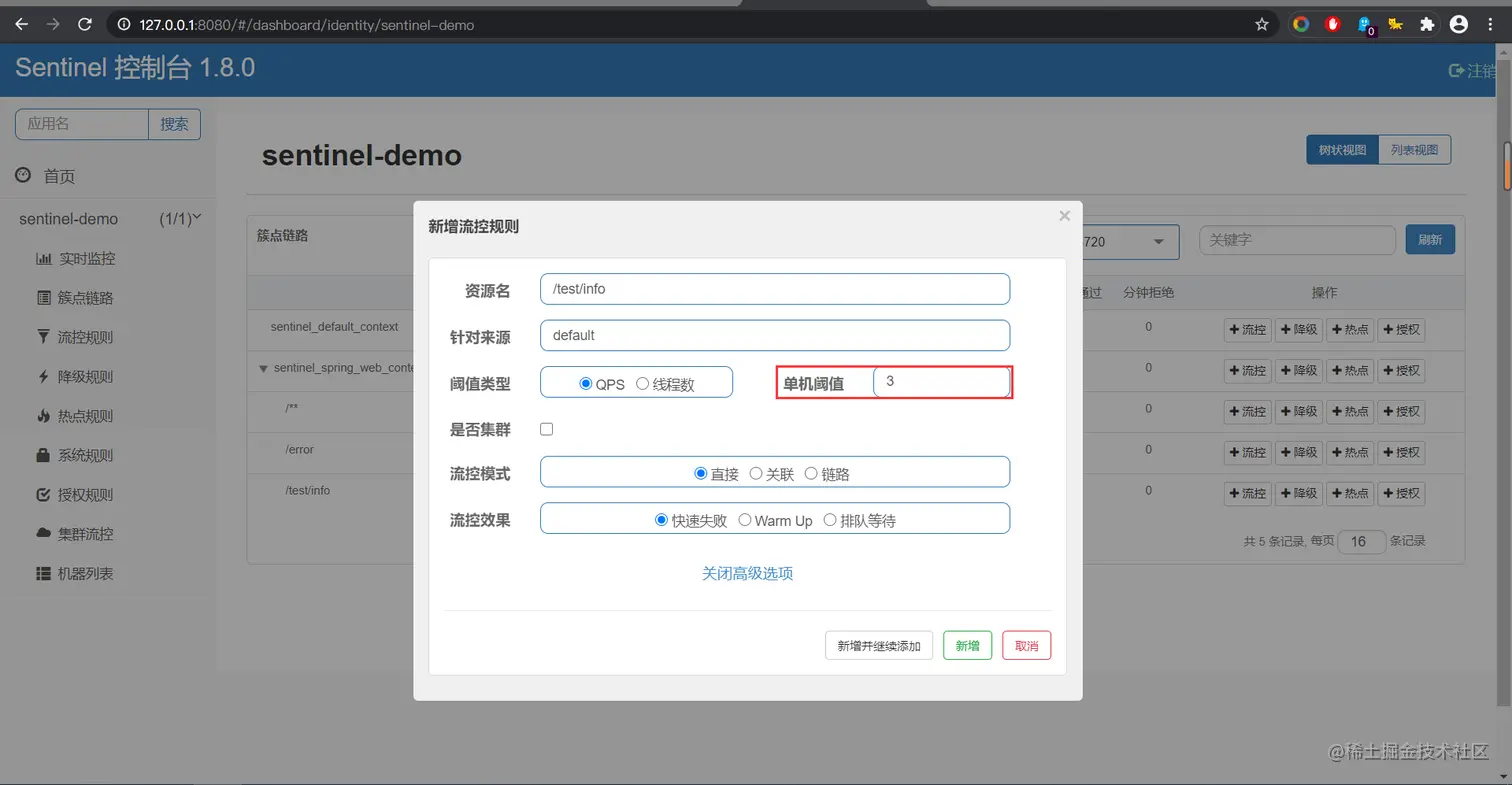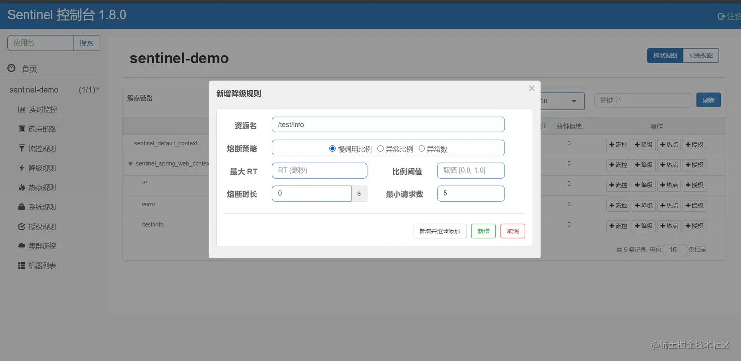 然后我们可以在Sentinel控制台当中对熔断、降级、限流等进行细粒度的配置。一个很好的原则是:约定>配置>编码。