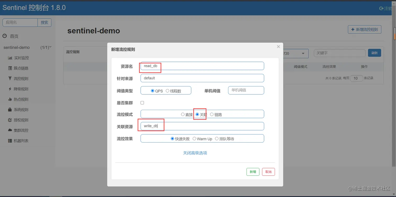 关联:当两个资源之间具有资源争抢或者依赖关系的时候,这两个资源便具有了关联。比如对数据库同一个字段的读操作和写操作存在争抢,读的速度过高会影响写得速度,写的速度过高会影响读的速度。如果放任读写操作争抢资源,则争抢本身带来的开销会降低整体的吞吐量。可使用关联限流来避免具有关联关系的资源之间过度的争抢,举例来说,read_db和write_db这两个资源分别代表数据库读写,我们可以给read_db设置限流规则来达到写优先的目的。(死贫道不死道友模式)