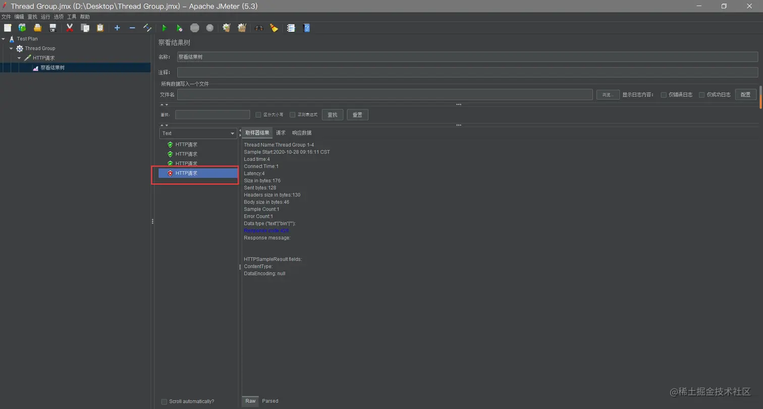 运行测试,查看结果树,可以看到,第4次请求超过了设定的阈值,请求失败