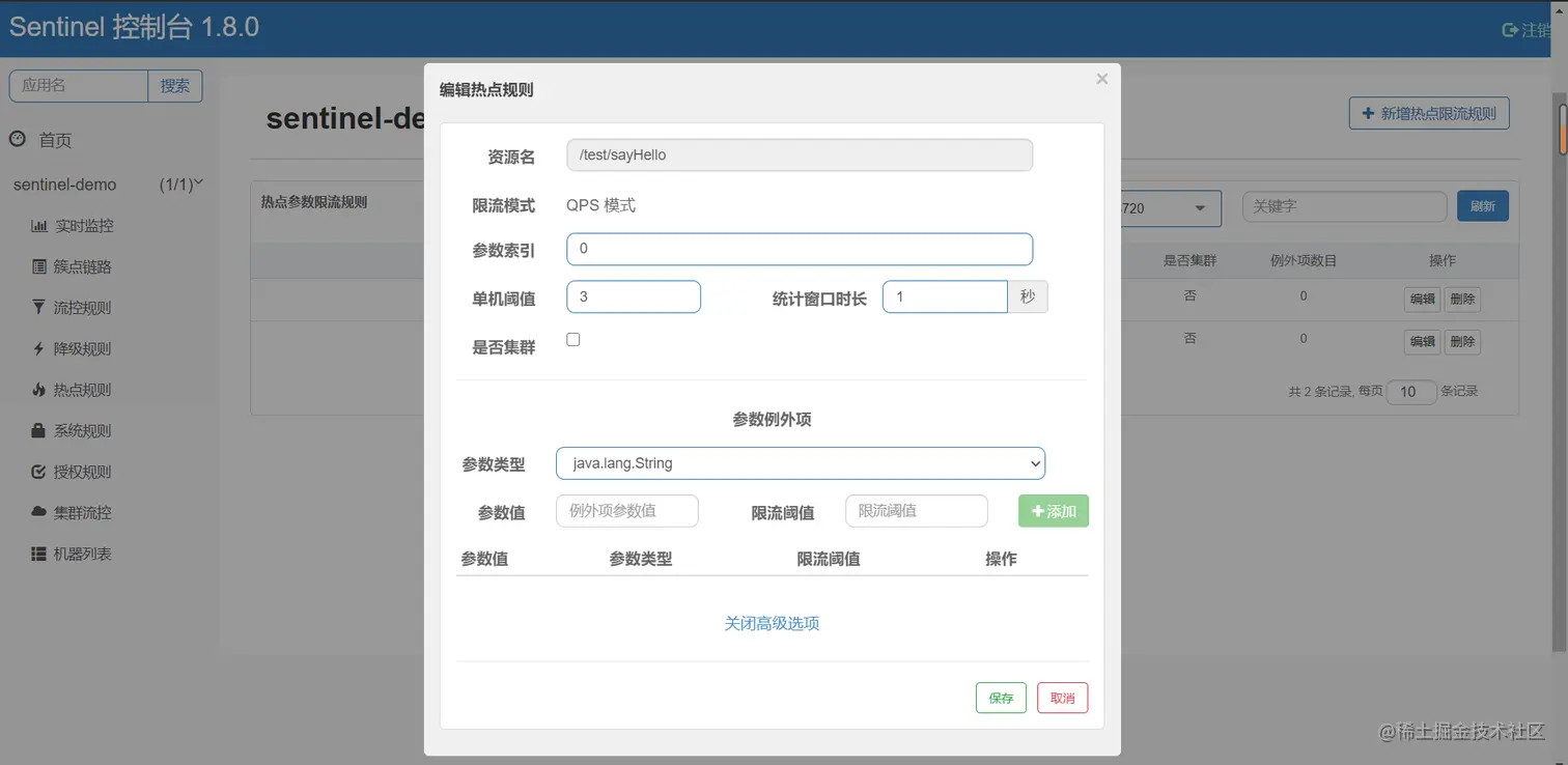 参数例外项,可以针对指定的参数值单独设置限流阈值,不受前面 配置阈值的限制。仅支持基本类型和字符串类型