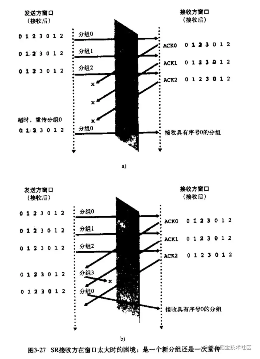 该问题的产生是由于窗口过大引起的,因此对于SR协议而言,窗口长度必须小于或等于序号空间大小的一半。