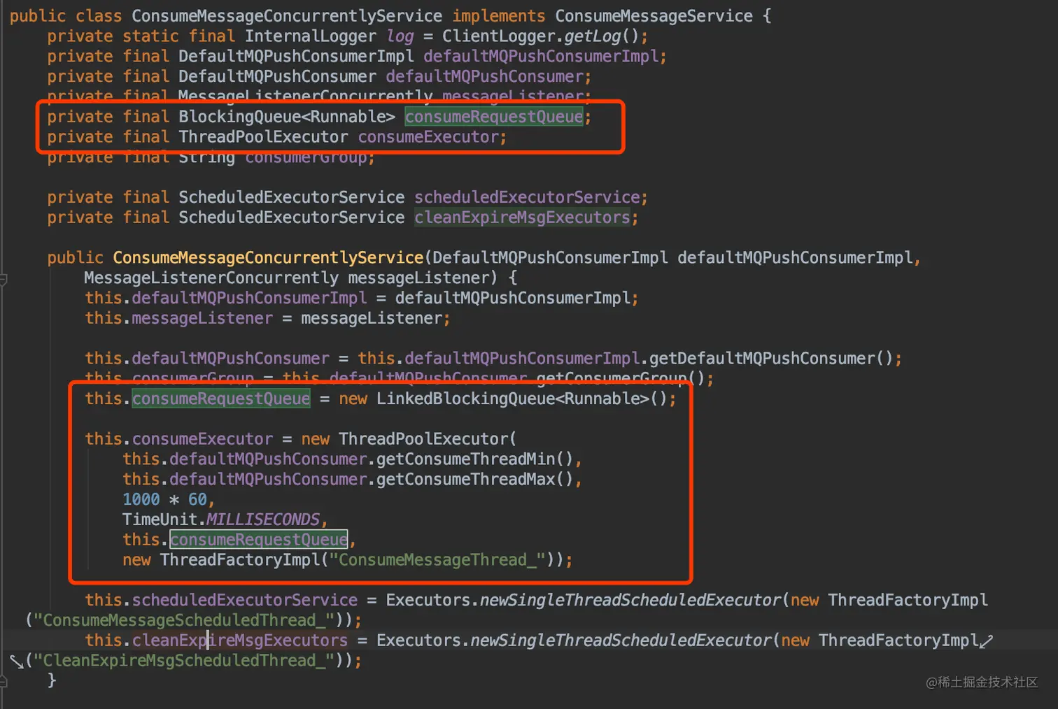 为了更好了解消费端的运行情况,我们自己封装了ConsumeMessageConcurrentlyService,使用了动态线程池来替换默认的线程池,上报线程池的运行参数到es后, 进行统一监管。