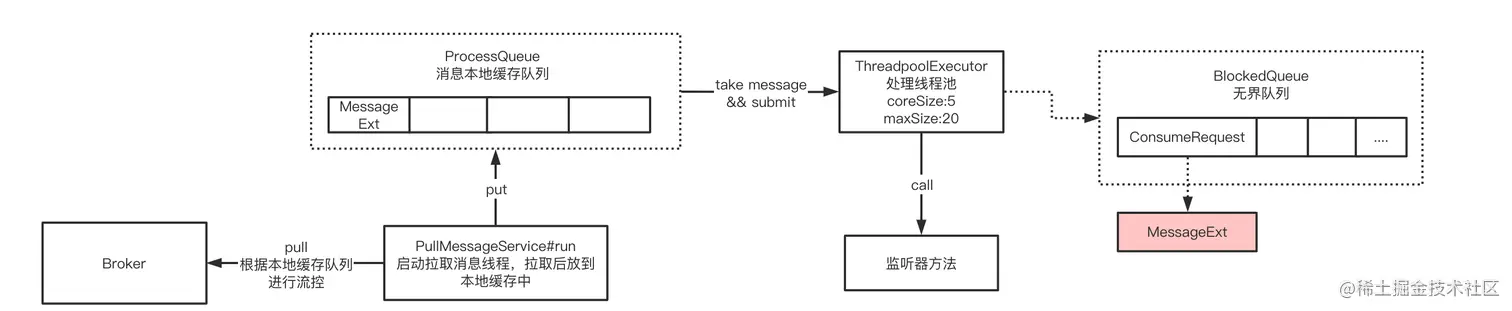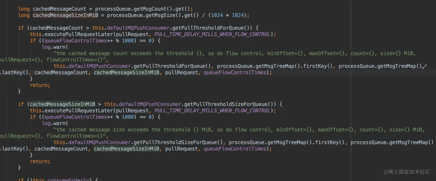 这里大家都有一个疑问,为什么mq客户端没有做流控处理吗?本地堆积了这么多的消息居然还会傻傻地去拉取新的消息?其实呢在 org.apache.rocketmq.client.impl.consumer.DefaultMQPushConsumerImpl#pullMessage有具体的流控逻辑,客户端是有根据本地缓存队列的内存大小和已存储的消息条数进行流量控制,比如有太多未处理的缓存消息就会选择不拉取。